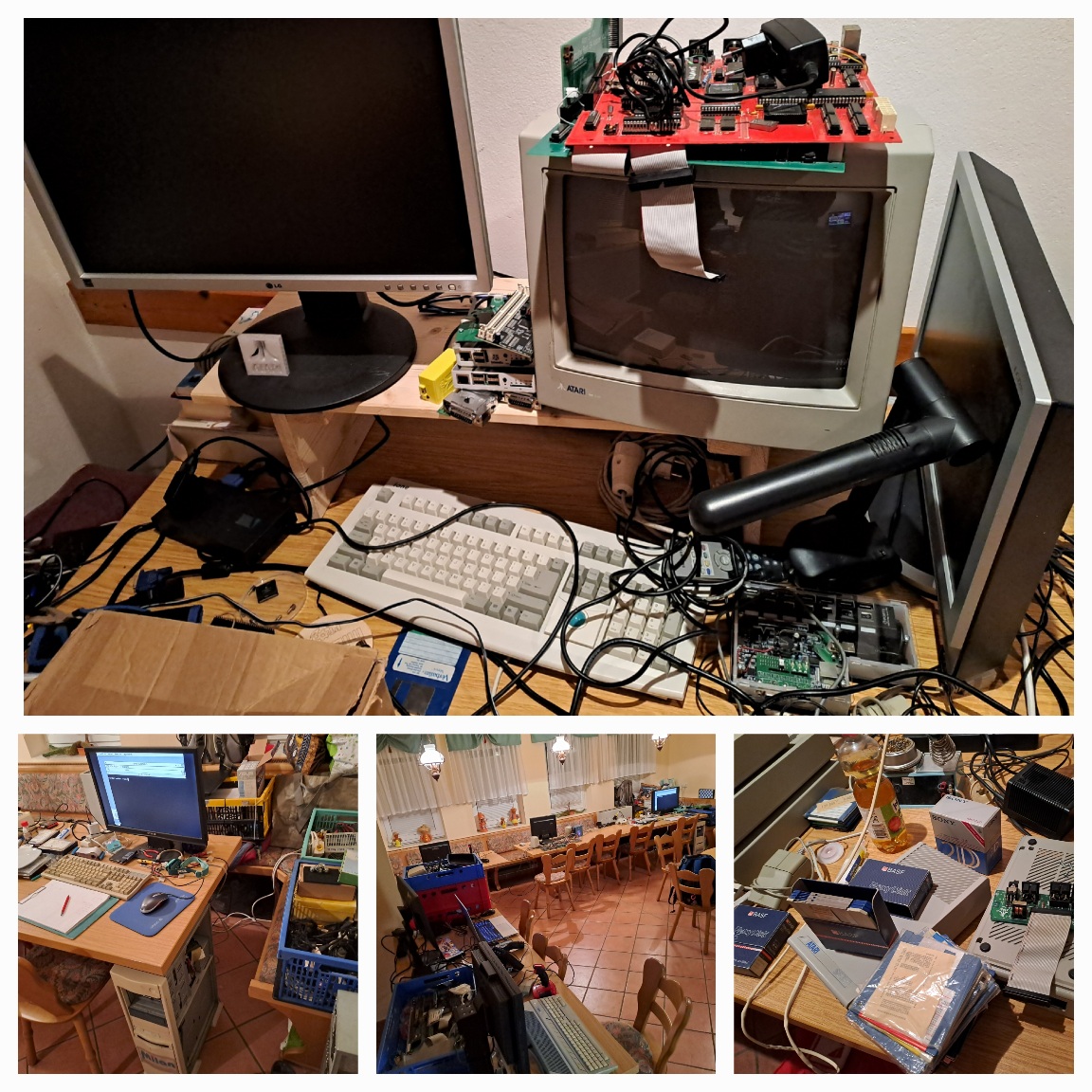 At the location we could spot some interesting hardware, lots of boxes for tinkering, building and soldering. A Falcon 060 was in place, a 130 XE setup, a Mega ST and also a Suska 3B board, among lots of other stuff.