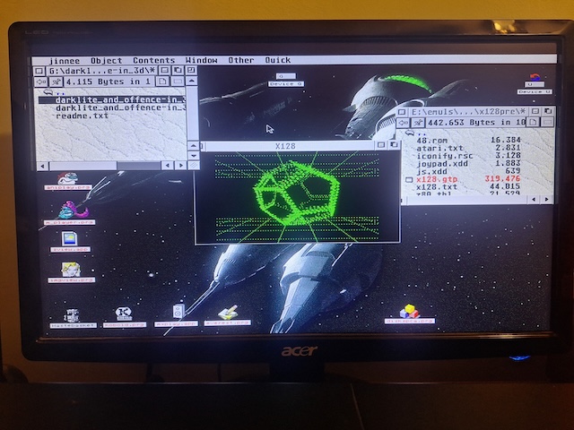 Well we’re going to take a close-up view of our next unexpected bonus item, with the miracle of emulation. Namely the crusty but still viable X128 ZX Spectrum emulator. Cautionary note, a CT60 or something else similarly powerful will be needed to run this one meaningfully.