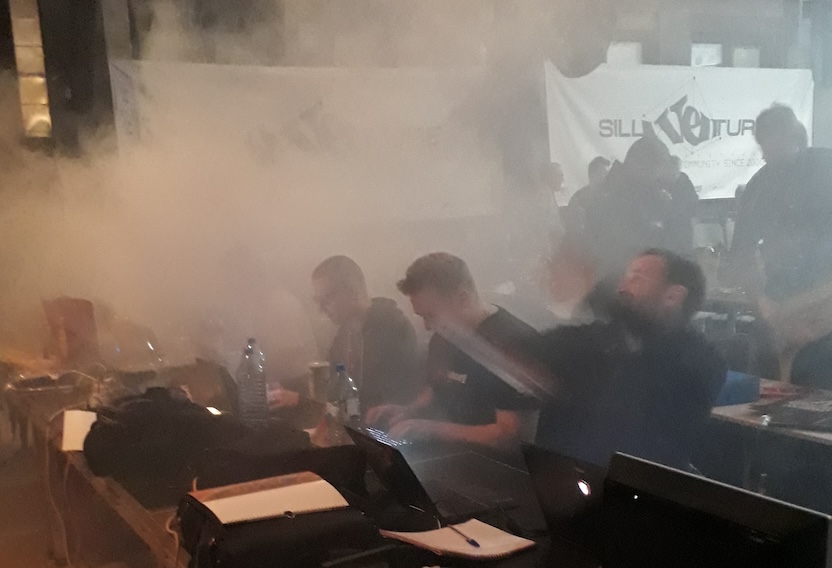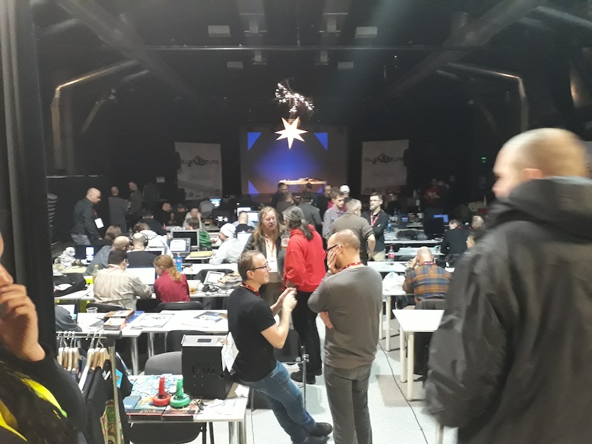 Various Frenchies and Paradox have arrived and the hall is looking busy. Also outside of the hall as well. We've had a couple of performances of the soundchip variety, one of those from gWEm. Whose last exultation of his gig was a peeved sounding "Attention water pumps!" (as in U96 Das Boot). It's as if he's got enough working knowledge to command an actual Type VII U-Boat sailing under the Atlantic in WW2, albeit in song form!