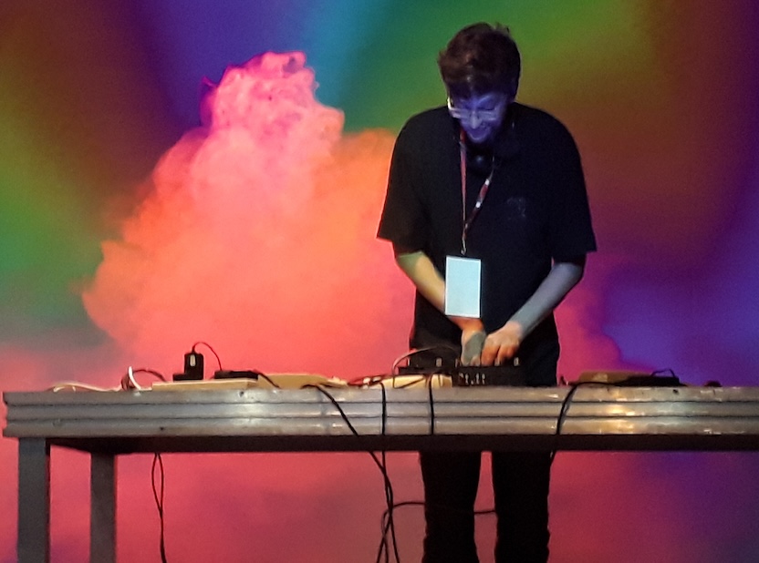 Regarding potentially hostile things, one of these could be the power supply to the tables or intermittency of this. Currently, it is in an 'off' state. The top table is 100 percent laptop, which eases things for a while. If all else fails, there is a mighty grand piano in the nearmost left corner, which could be played for an 'unplugged' soundchip music compo?