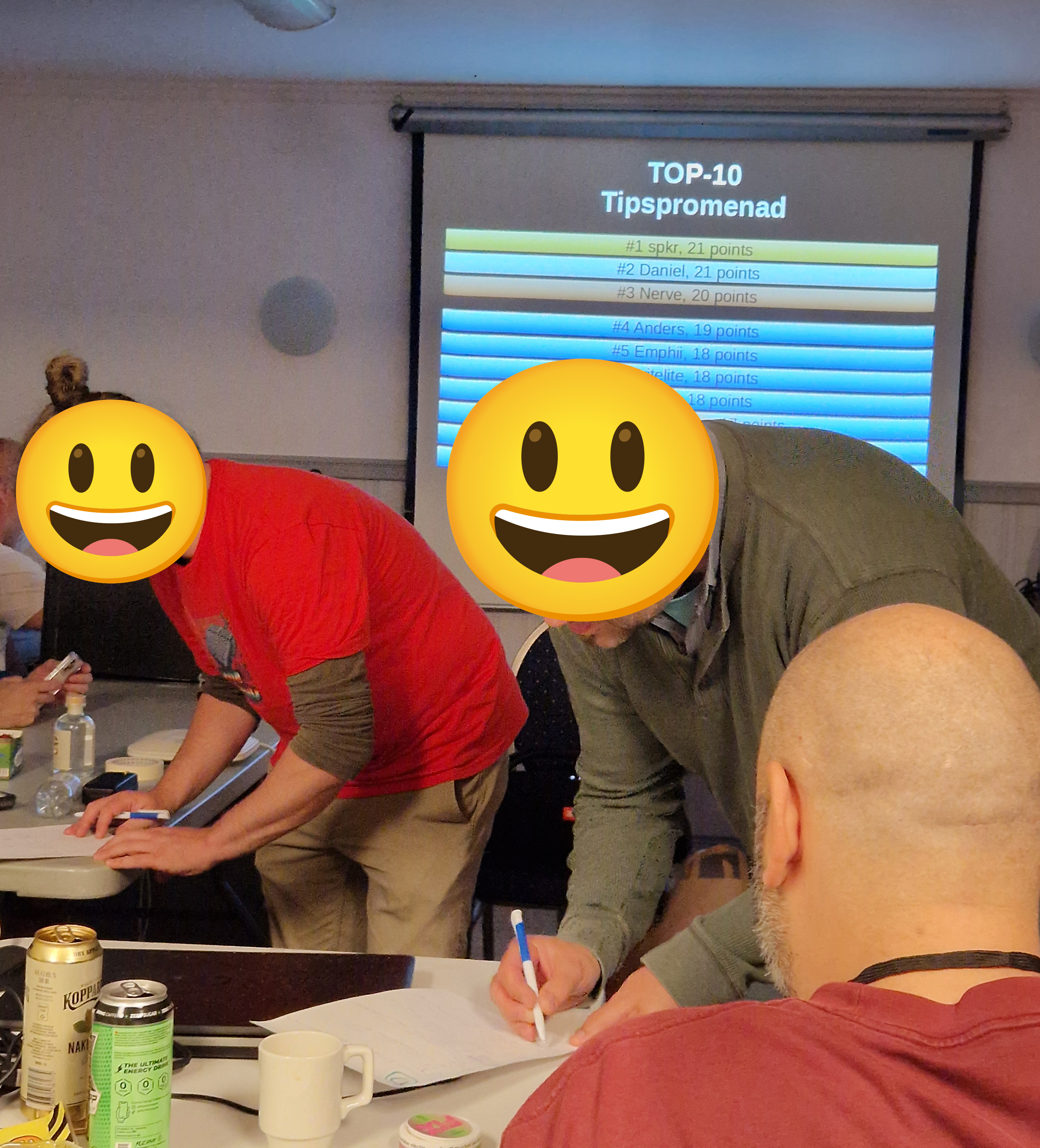 Following the set, it was time for the competition results, beginning with the outcome of Tipspromenad '25. It turned out to be a tie at the top between Spkr of smfx and Daniel of New Beat. To settle it, Evl had prepared a set of tie-breaker questions.