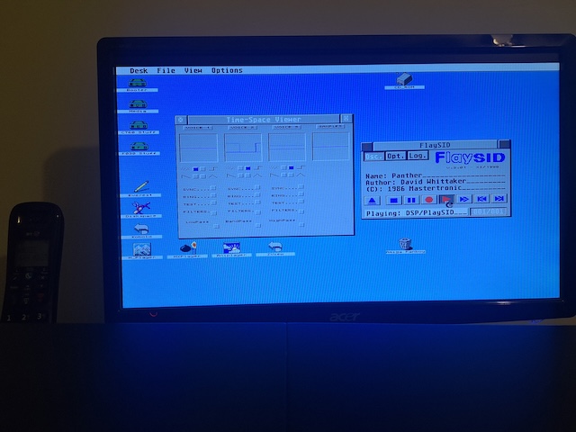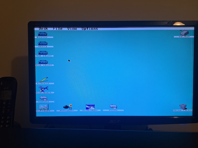 Getting an 800 x 608 screen was easy. The next step was a 1024 pixel width adjacent screen mode. After a little experimentation, I settled on a 1024 x 640 mode for 256 and 16 colours. This mode, apart from putting a little less stress on the Videl, manages to eliminate the mildly annoying pixel stretching you get on a wider aspect ratio screen. Presumably the firmware for a modern screen can comfortably lock onto it. For comparison you can get to a 640 x 480 truecolor classic VGA screen with relative ease, but in that case, stretchy horizontal pixels are noticeable.