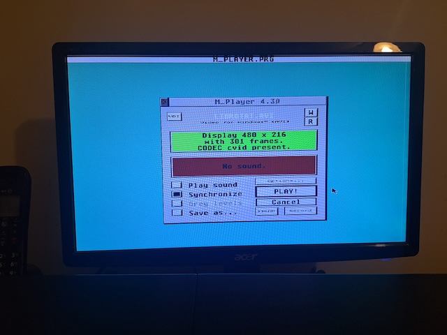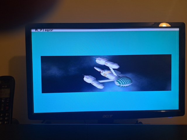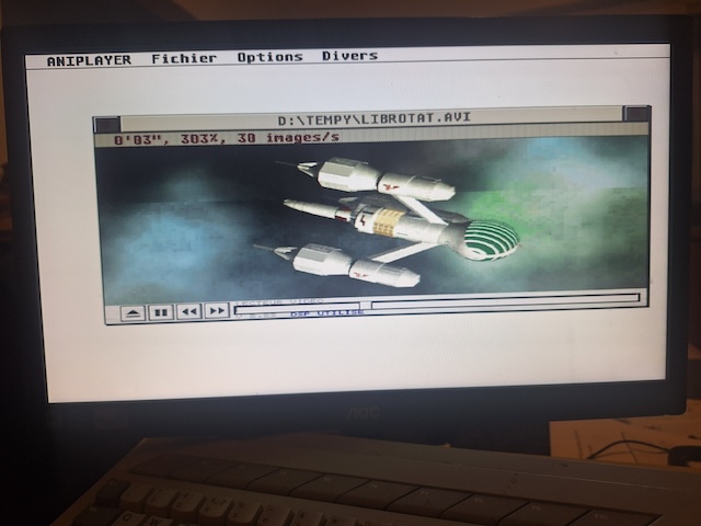 For comparison, here’s a photo I took of the same movie on Aniplayer and Centurbo 2 with the available 640 x 480 Truecolor mode there. This displays comfortably and animates convincingly, but check out the cpu usage! Wheezy or what?