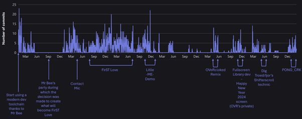 The development of these effects was incredibly sporadic, with long stretches of complete inactivity lasting several months. It was treated as more of a hobby, with other priorities consistently taking precedence. I’m attaching a screenshot of our GitLab commits so you can see how the progress unfolded across all our releases since 2019.