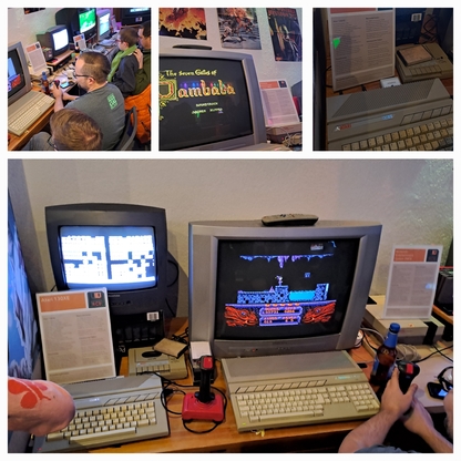 It was quite exciting to meet people you have never seen before, suddenly revealing their enthusiasm or expert knowledge, Atari-related or not. One older visitor sat down in front of the Atari 130XE and started programming some BASIC, like it was yesterday. I was even able to contribute with a few Poke values that were burnt deep in my neural fundament since 30 years it seems (710,10 to be exact:). Beside that the Atari machines were mostly used for gaming, with Thalion's "7 Gates of Jambala" being a permanent attraction.