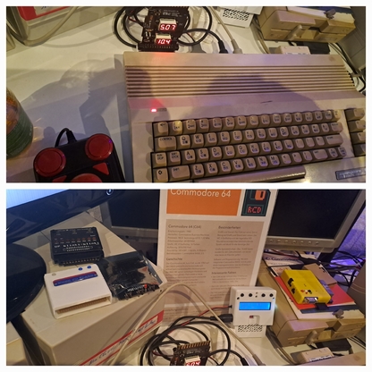Of course, during the event you could find also more well-known items. The Commodore corner was represented by a C-64 II running Giana sisters most of a time and there was also an older C64-variant on the shelf. The C64 II was encircled by all kind of interesting cartridges for different purposes.