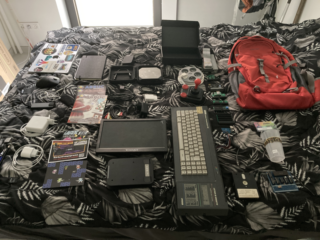Omnicharge powerbank, tablet stand, screen, 6128 CPC, Mini-Gotek, Competition Pro joystick, Macbook Pro M1, AMSTEAM (kinda like Sidecart online gaming database but for CPC), M4 (Fujinet alike for the CPC), GEMINI 512KB RAM expansion for the CPC,