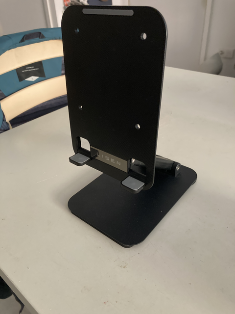 To raise it to eye-level, instead of using it's rather low monitor stand, I drilled the VESA mount holes into